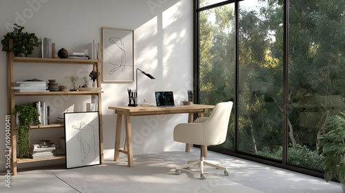 © utaem2022, Obraz premium Home office with desk, chair, and large window overlooking nature