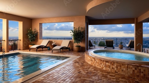 Fototapeta premium Home spa with indoor pool, freestanding bathtub and terrace