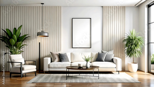 Fototapeta premium Home Vertical black frame mockup mockup, white luxury minimalist living room...