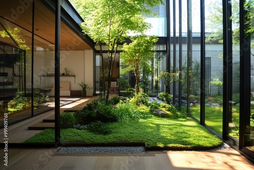 © Matcha_09, Obraz premium Home with indoor garden, glass walls, natural light, and sustainable materials creating a green, serene living environment