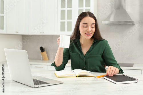Obraz premium Home workplace. Happy woman opening notebook near laptop at marble desk in kitchen