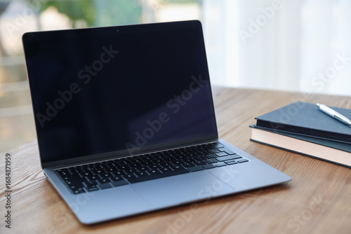 © New Africa, Fototapeta premium Home workspace. Laptop and stationery on wooden desk indoors, closeup