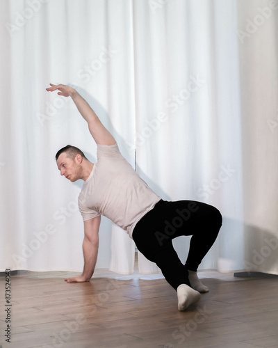 Fototapeta premium Home yoga pose workouts. A man performs sports exercises with his legs and arms. Male athlete stretches.
