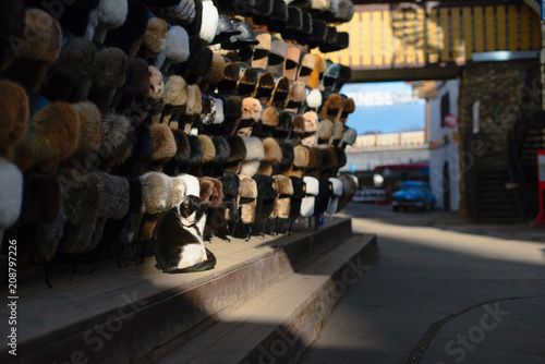 © myskina6, Fototapeta premium Homeless cat washes on the background of fur hats