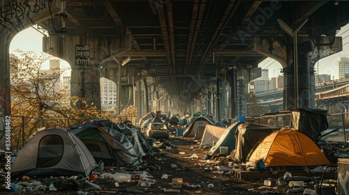 Naklejka premium Homeless encampment under a city bridge, with tents and makeshift shelters