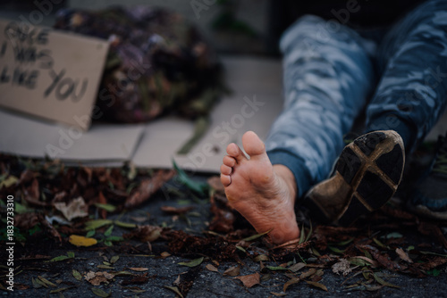 © Ljustina, Obraz premium Homeless man lying on street with sign