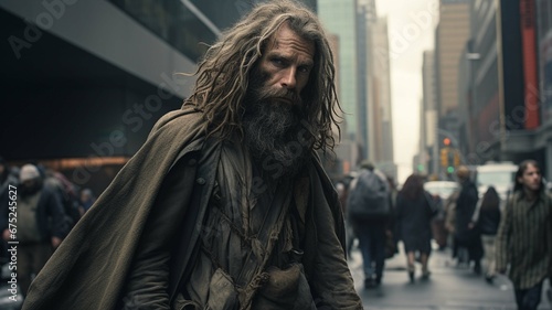 Fototapeta premium Homeless man on the street of a big city, alcoholism, drug addiction, low...