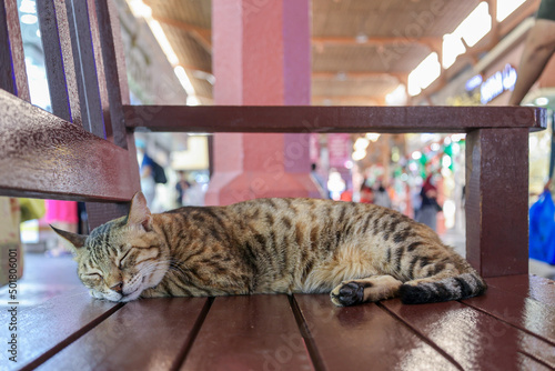 © lara-sh, Naklejka premium Homeless tabby cat sleeps on bench at on Traditional market in Dubai, UAE, selective focus. High quality photo