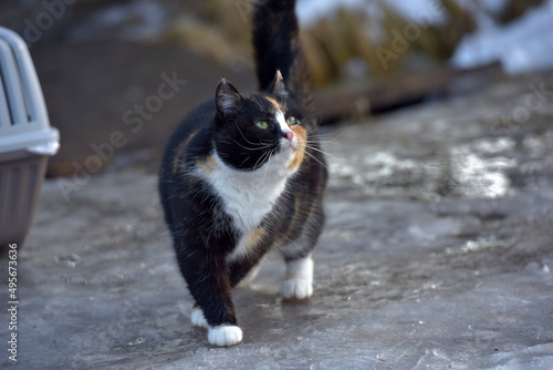 Fototapeta premium homeless tricolor cat outdoors in winter