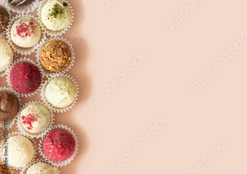 © miss.lemon, Naklejka premium Homemade candy close up on a pink background. Truffles with coconut, chocolate, karkade and nuts. Energy balls, superfood. Copy space, top view, flat lay.