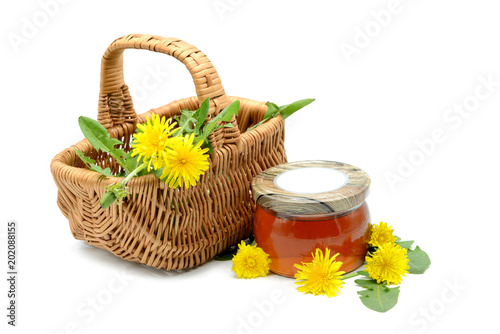 Obraz premium homemade Dandelion honey with honey glass and flower heads of danelion flower in a basket. isolated white background