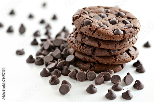 Fototapeta premium Homemade dark chocolate chip cookies stacked on a white surface