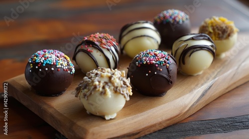 © Greentree, Obraz premium Homemade ice cream ball melts on wooden table.