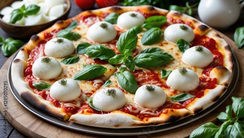 Fototapeta premium Homemade Italian Margherita pizza topped with mozzarella.