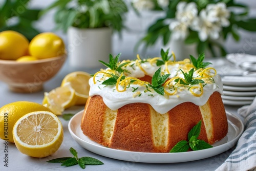 © kardaska, Obraz premium Homemade lemon bundt cake with icing and fresh mint garnish