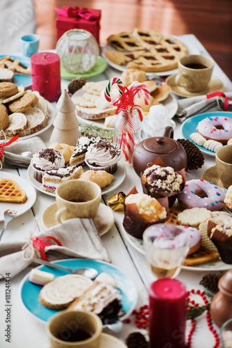 © pressmaster, Naklejka premium Homemade pastry and desserts on plates served on festive table for guests
