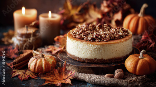 Fototapeta premium Homemade pecan cheesecake surrounded by autumn leaves, pumpkins and candles, capturing the cozy essence of fall dessert and seasonal celebration.