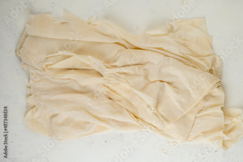 Obraz premium Homemade phyllo dough thin sheets. top view