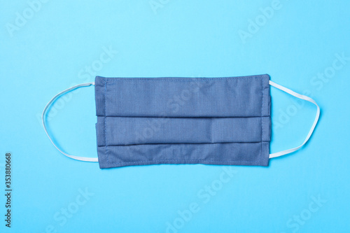 Fototapeta premium Homemade protective mask on light blue background, top view. Sewing idea