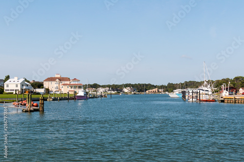 © sherryvsmith, Naklejka premium Homes and boats on Lake Wesley at Rudee Inlet in Virginia Beach, Virginia.