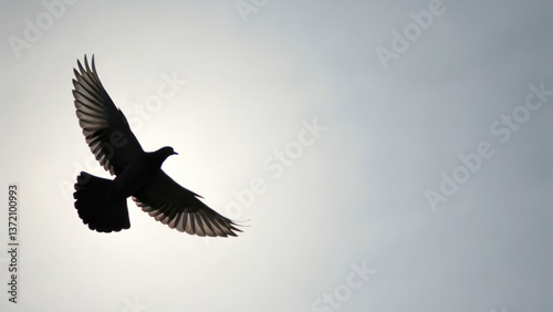 Fototapeta premium homing pigeon flies against bright,overcast sky for websites or blogs about birds,nature,or even historical communication methods,as homing pigeons were once used to carry messages