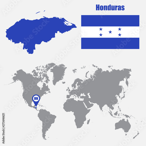© stas111, Obraz premium Honduras map on a world map with flag and map pointer. Vector illustration