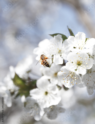 Fototapeta premium Honey bee feeds nectar from spring white blossoming tree