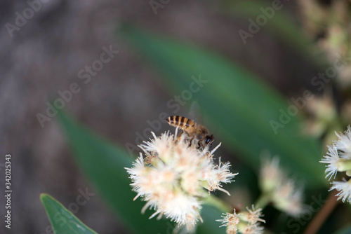 © chaiudon, Obraz premium Honey bee in flight approaching blossoming