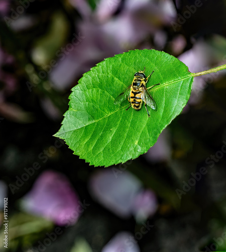 © jay, Fototapeta premium Honey bee on a rose bush leaf, blurred background