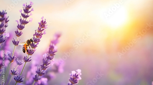 © Bonsales, Naklejka premium Honeybee collecting lavender nectar during golden sunset light, highlighting pollination within blooming agricultural landscape