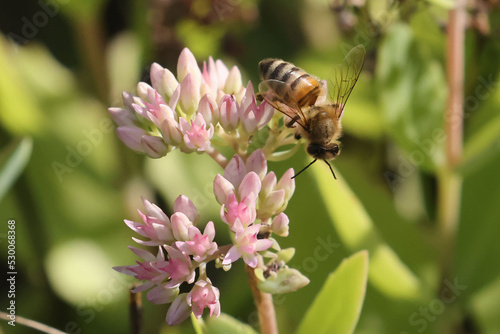 Fototapeta premium Honeybee feeding on small pink flower
