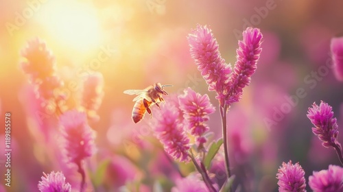 © Gendowor, Naklejka premium Honeybee in flight amidst vibrant pink flowers at sunset.