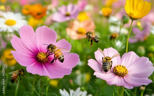 © Daniele, Fototapeta premium Honeybees on Beautiful Pink Cosmos Flowers in a Garden