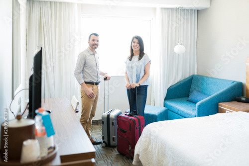 Obraz premium Honeymooners With Luggage In Hotel Room