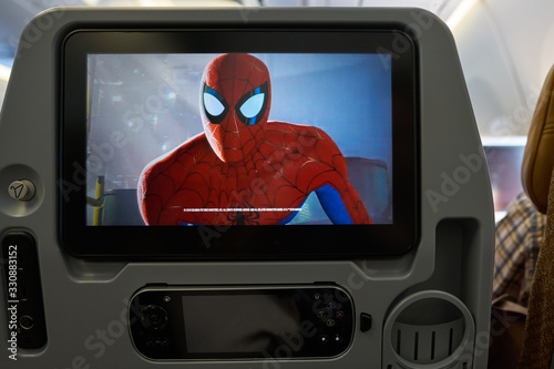 © Heorshe, Naklejka premium HONG KONG - CIRCA APRIL, 2019: seat back screen in economy class on Singapore Airplines Airbus A350.