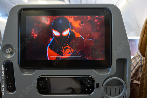 © Heorshe, Naklejka premium HONG KONG - CIRCA APRIL, 2019: seat back screen in economy class on Singapore Airplines Airbus A350.