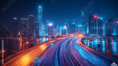 © TatChong, Fototapeta premium Hong Kong City Skyline Night Lights Traffic Trails