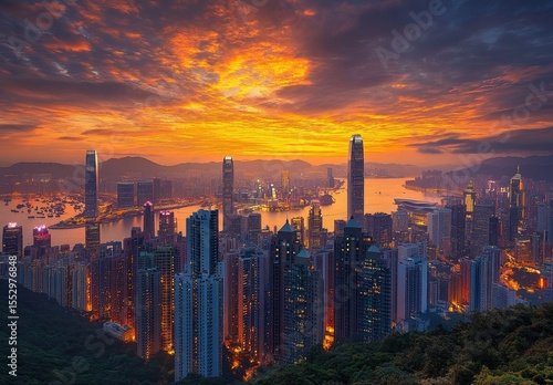 © Kenari, Fototapeta premium Hong Kong cityscape at fiery sunrise