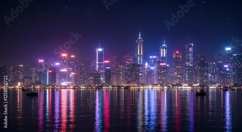 © abangaboy, Fototapeta premium Hong Kong Cityscape at Night with Illuminated Skyscrapers and Water Reflection