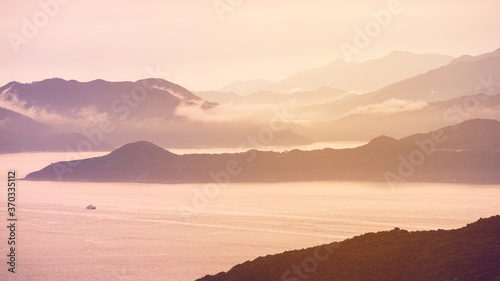 Fototapeta premium Hong Kong ocean sunset mountain heaven background nautical vessel cargo ship...