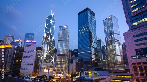 © AgungRikhi, Obraz premium Hong Kong Skyline at Dusk with Illuminated Skyscrapers