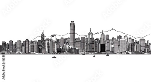 © time, Naklejka premium Hong Kong Skyline Illustration with Victoria Peak and Boats on the Water