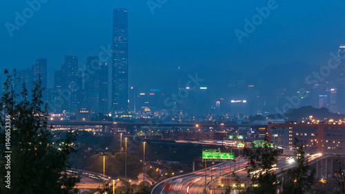© HyperlapsePro, Fototapeta premium Hong Kong Skyline near Container Terminal day to night aerial timelapse