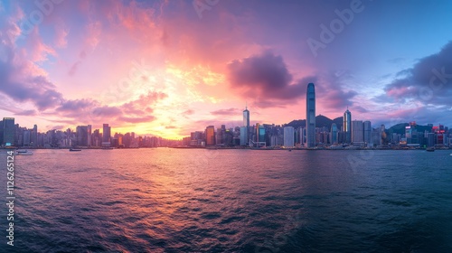 Naklejka premium Hong Kong Skyline Sunset: A panoramic view of Hong Kong's iconic skyline...
