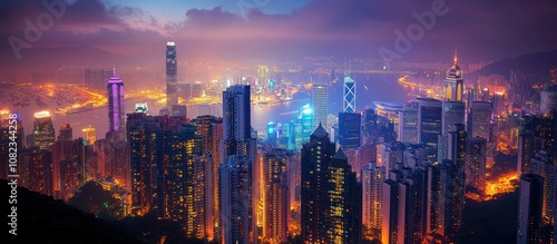 Fototapeta premium Hong Kong skyline with skyscrapers and buildings at sunset.
