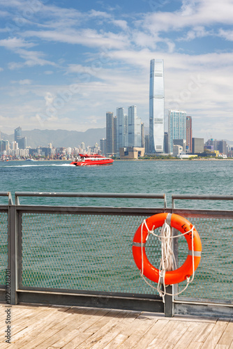 © Evgeny Karandaev, Fototapeta premium Hong Kong skyscraper panorama on a sunny day with water and boats