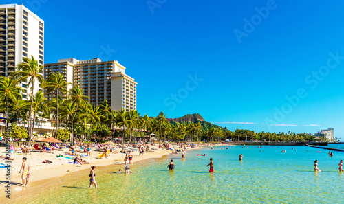 © ggfoto, Fototapeta premium Honolulu, Hawaje - 16 lutego 2018: Widok na plażę Waikiki. Skopiuj miejsce na tekst.