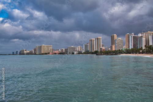 © Alexander Glenn, Fototapeta premium Honolulu Oahu Hawaii Skyline view from Ocean on cloudy day
