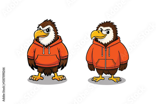Fototapeta premium Hooded Eagle Duo: Cartoon Birds with Orange Apparel, Standing Adorably on White, Vector Illustration with Playful Design.