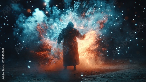 Obraz premium Hooded Figure Conjures Fiery Cosmic Dust Storm